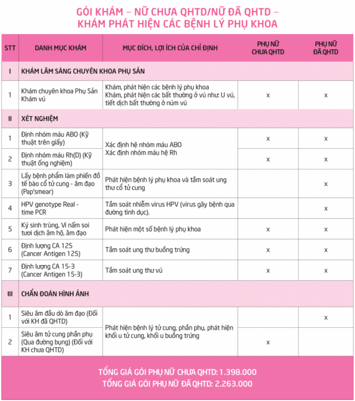 Gói khám – nữ chưa qhtd/nữ đã qhtd – khám phát hiện các bệnh lý phụ khoa